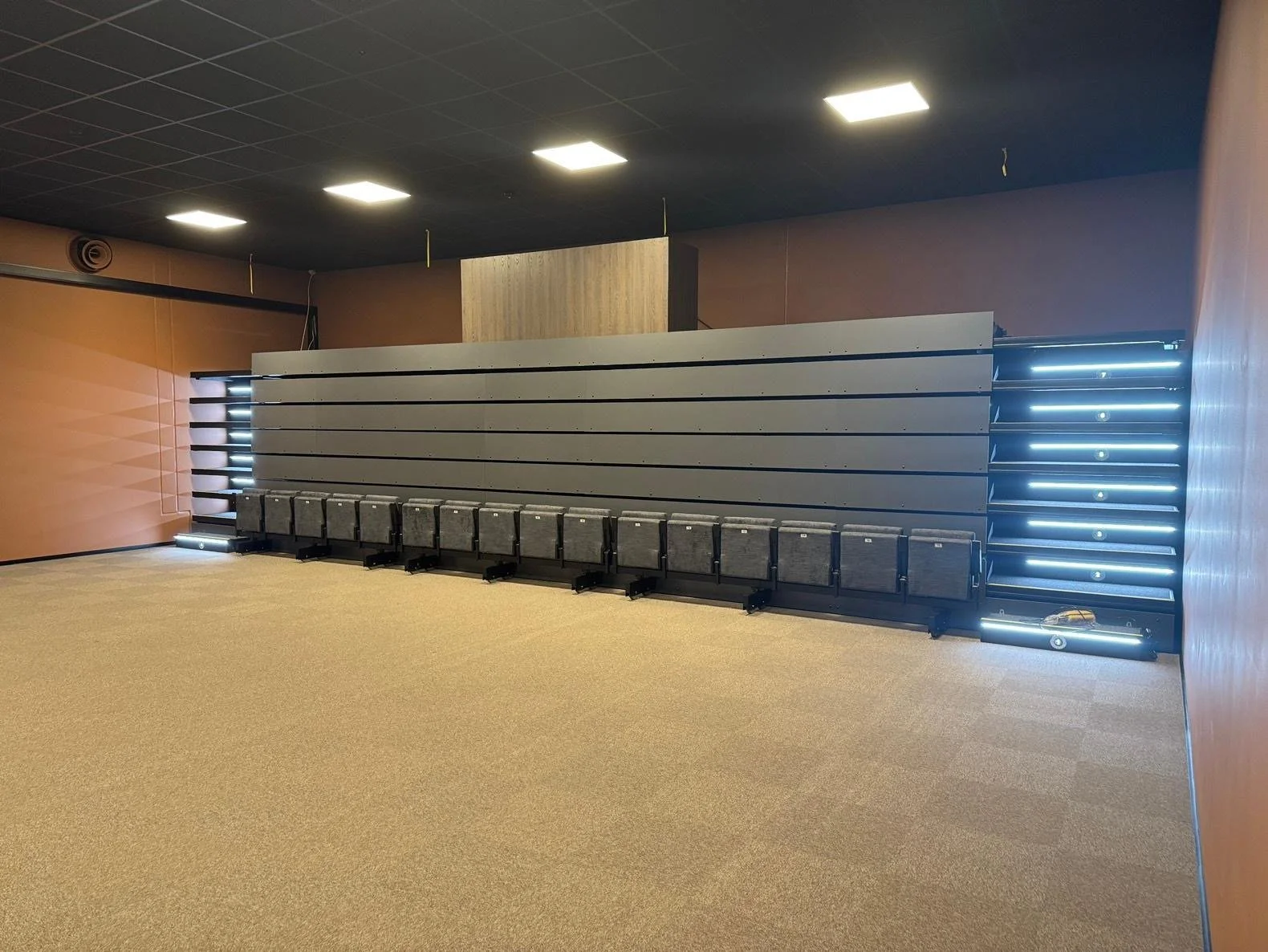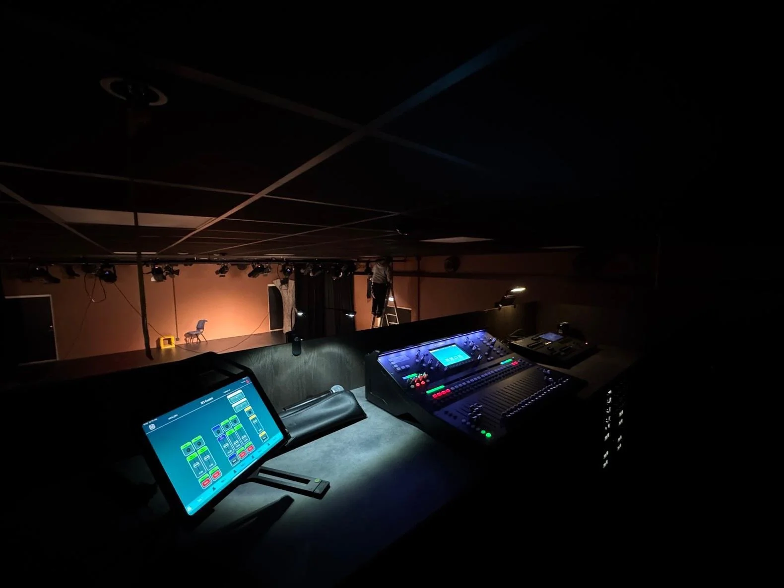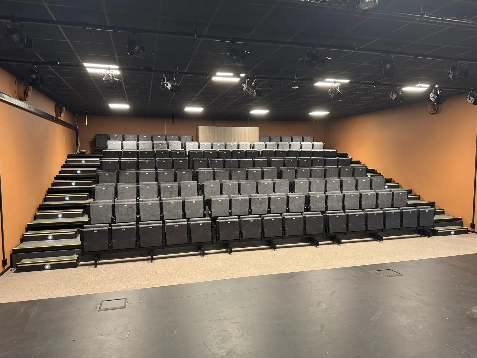 Våre gutter i teknisk gruppe arbeider på spreng med montering av lyskastere, høytalere og alt det andre tekniske som må på plass for å gjøre teatersalen klar til åpningen. Vi har også fått montert teleskopamfi og nå har vi like gode seter i salen vår som i Operabygget i Oslo.