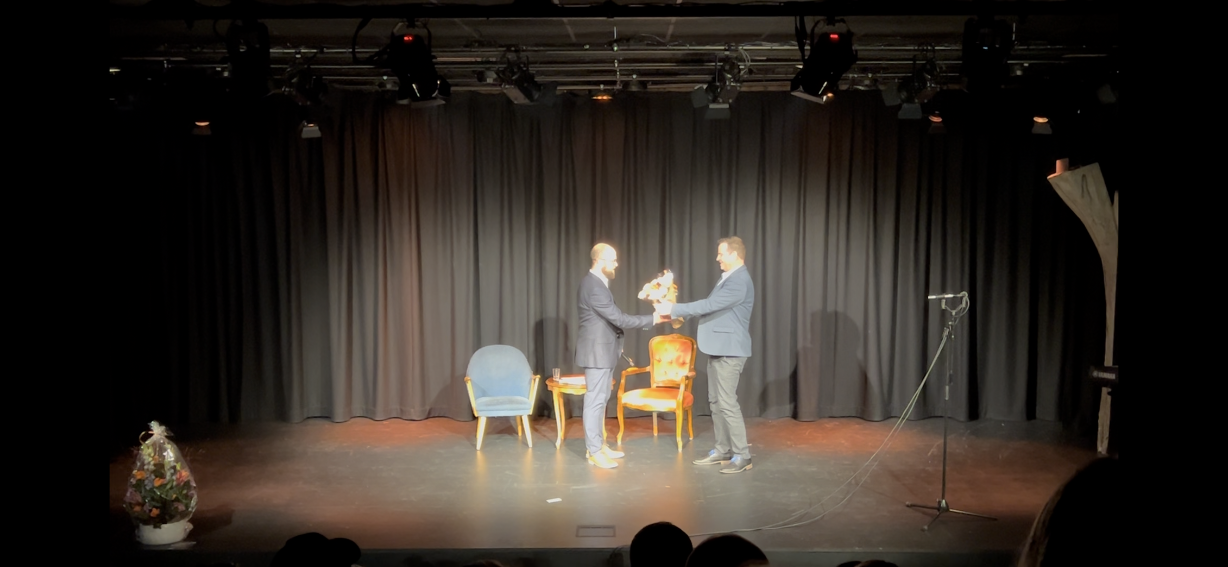 Dagen startet med velkomst og mingling i den lyse og innbydende kaféen, hvor både nye og gamle teatervenner møttes. Styreleder ønsket velkommen med tale, før gjestene ble invitert med på omvisning i det nye bygget – ledet av ingen ringere enn teaterets egne maskoter, de sjarmerende Pierrot-figurene.