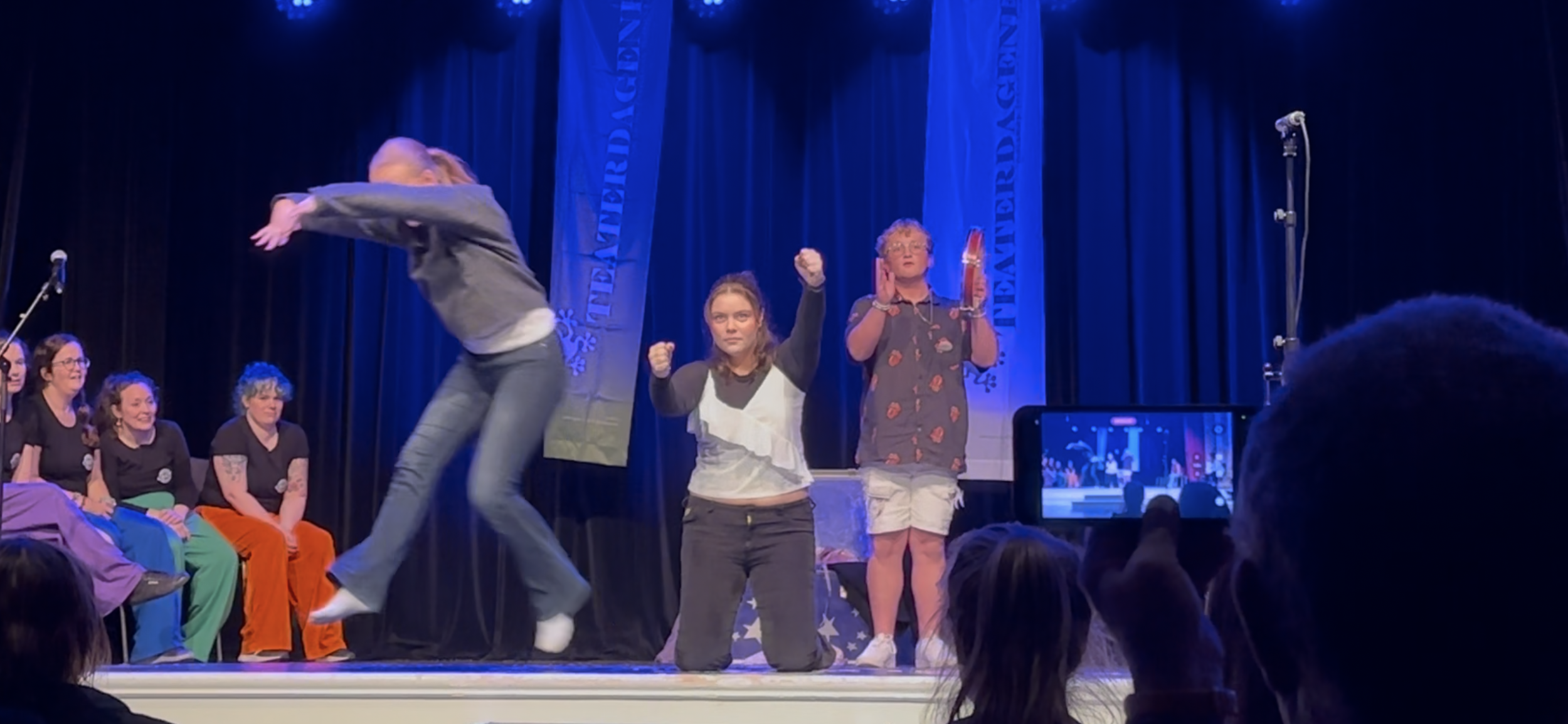 Deretter gikk barn fra alle våre teatergrupper på scenen og ga publikum et innblikk i teaterhverdagen – med et utvalg av teaterøvelser vi bruker på våre ukentlige øvelser. Det var inspirerende å se barn i alle aldre vise ekte sceneglede og samspill.